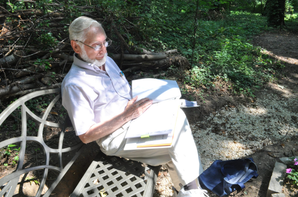 He obliged me, easing himself onto the bench in the back corner of the woods and sliding a binder out of his tote bag. With a raspy clearing of his throat, he began to read. I took a few quick pictures but was soon sitting before him, cross-legged on the forest ivy, bugs and leaves tickling my legs.